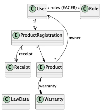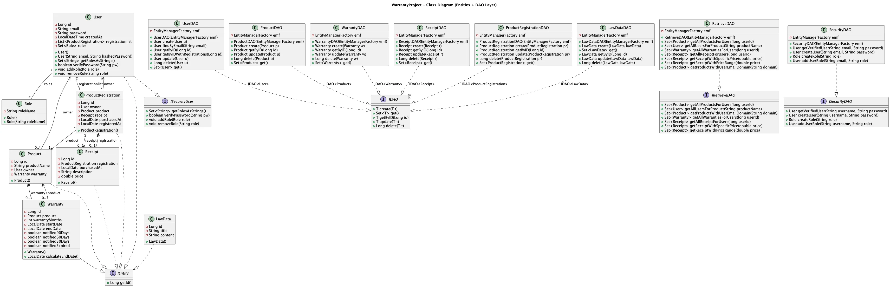Registrations may have receipts, and products have warranties. I implemented JPA mappings between User, Product, ProductRegistration, Receipt, and Warranty, then built a DAO layer that standardizes CRUD operations through IDAO<T> and uses JPQL for queries that traverse relationships (implemented in RetrieveDAO and selected methods in UserDAO/SecurityDAO).